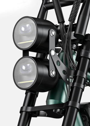 Агрессивный стиль с длинным сиденьем, массивной рамой и двойной фарой для максимальной видимости и уникальной эстетики. -