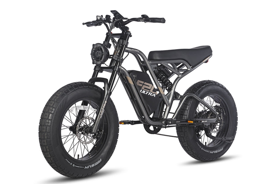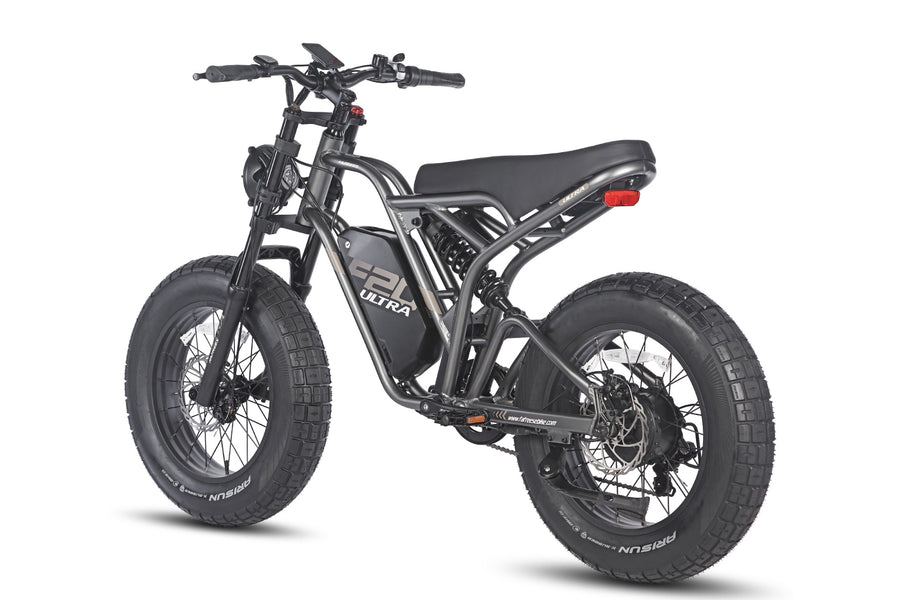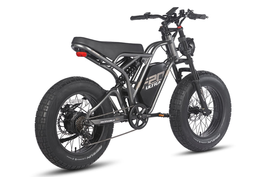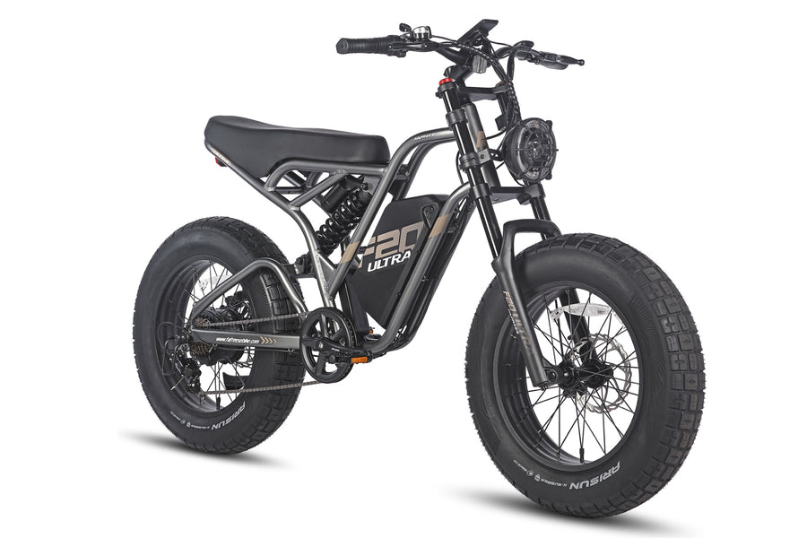 Изготовленный из прочной рамы из алюминиевого сплава, F20 Ultra одновременно легкий и прочный, выдерживая райдеров весом до 150 кг. Толстые шины 20x5,0 дюймов обеспечивают превосходное сцепление и устойчивость на различных поверхностях, включая гравий, снег, песок и асфальт. Блокируемая передняя амортизационная вилка поглощает удары, обеспечивая плавную и комфортную езду даже по ухабистым дорогам.