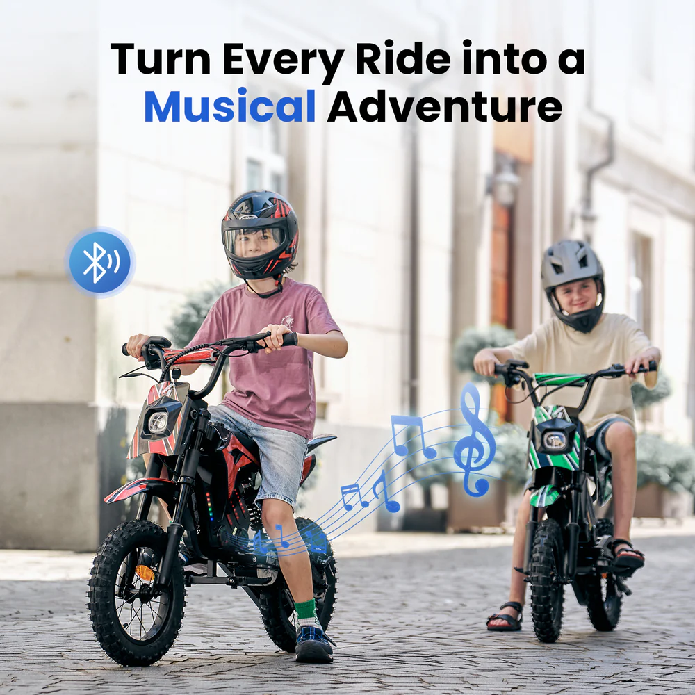 Идеально подходит детям и подросткам 3–16 лет, которые хотят электрический dirt bike для подходящих частных площадок и лёгкого внедорожного катания. Максимальная нагрузка — до 80 кг.