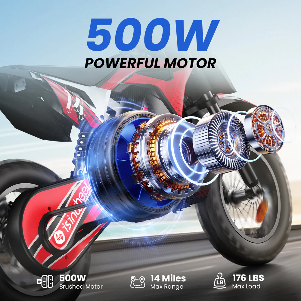 isinwheel A14 — это детский электрический dirt bike, созданный для весёлой, удобной и более безопасной езды. Мотор мощностью 500W, аккумулятор 36V 5.2Ah и пневматические шины 14" обеспечивают хорошую управляемость и запас хода до 22 км на одном заряде.