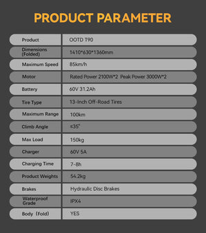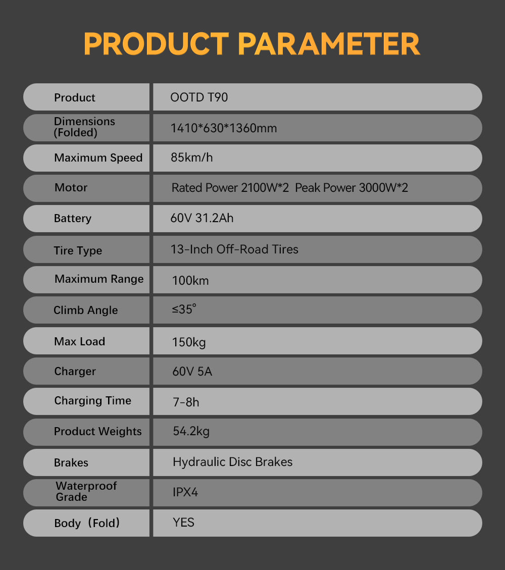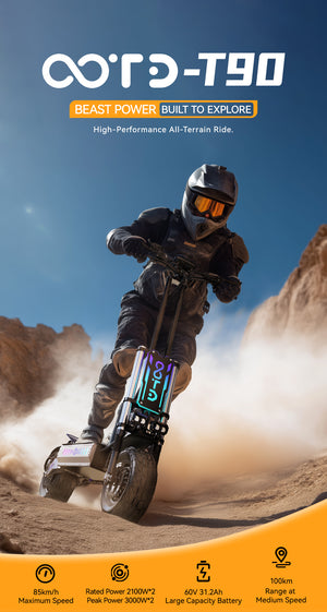 OOTD T90 разработан для опытных райдеров, которым нужна экстремальная мощность, большой запас хода и комфорт на любой местности. Независимо от того, едете ли вы по городу или преодолеваете трудные бездорожья, этот самокат обеспечивает первоклассную производительность и стабильность.