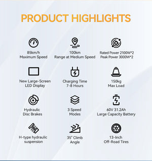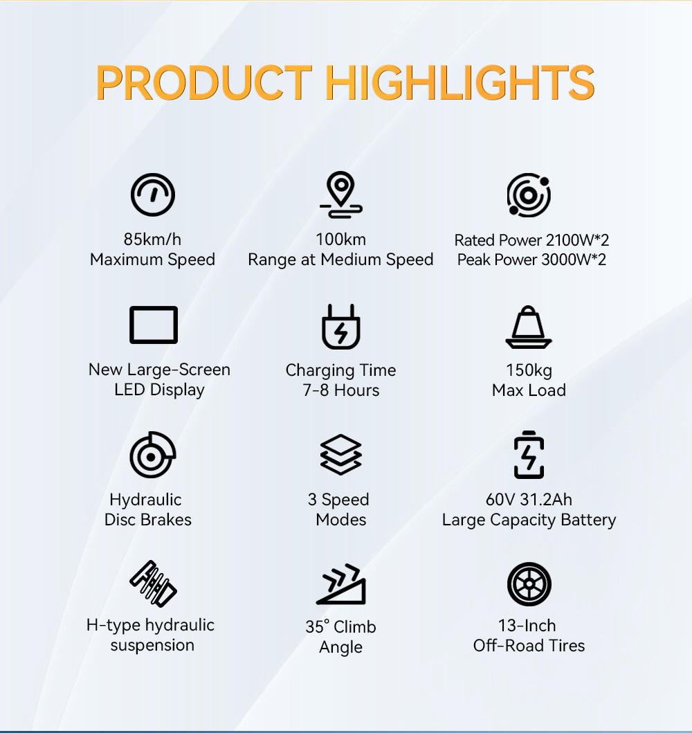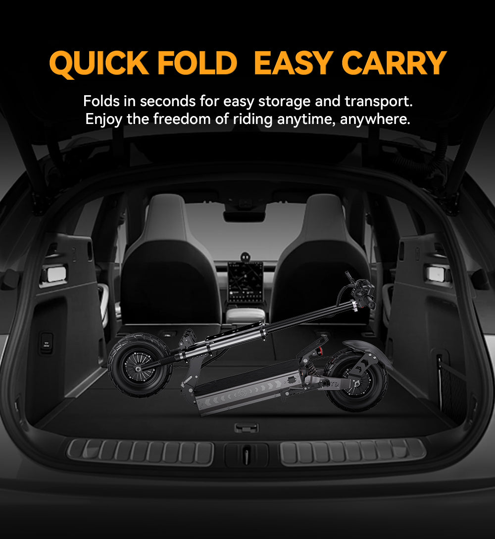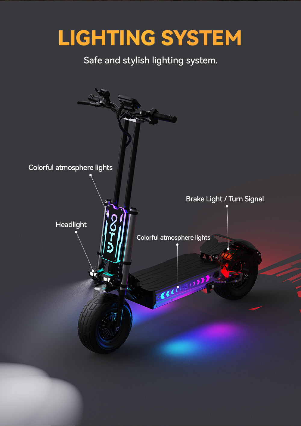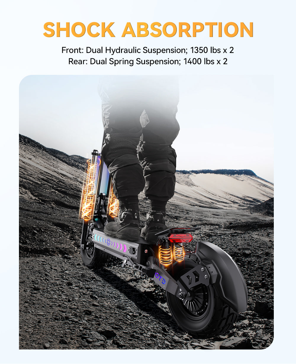 OOTD сочетает в себе необузданную мощность и прочную конструкцию, создавая самокат, разработанный для серьезных райдеров. Два двигателя с пиковой мощностью 3000 Вт, аккумулятор 60 В 31,2 Ач и гидравлическая подвеска обеспечивают быстрое ускорение и плавное управление. 13-дюймовые бескамерные шины обеспечивают отличное сцепление с дорогой, а гидравлические дисковые тормоза гарантируют уверенное торможение даже на высоких скоростях.